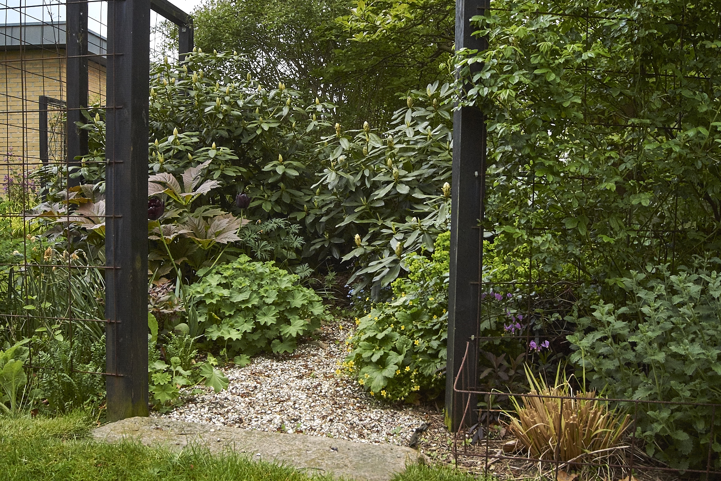Stien set fra den anden side med dronningebusken på venstre side og på højre side er det en rododendron, som titter frem gennem rionettet. Måske kan det lige skimtes, at der er lidt planter for "enden" af stien.
